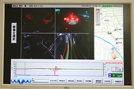 こちらは車線を検知するドライブレコーダーです。擬似的に模型にメインカメラをとりつけた映像を流しています。車線がずれるとそれを検知して、音で警告すると同時に、カードの中にどこでフラついたのかがわかるようにハザードマップに記録します。ウィンカーを出しているときは、警告音は出ません。