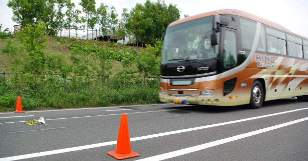 「セレガ」14年モデルの前方に、クルマの代わりとなる停止障害物を設置。バスは70km/hで接近し、まずは「PCS」のシステムのみが作動し、ドライバーが回避行動を行わない場合が試されました。「PCS」のブレーキによって、バスは減速しながら障害物を通過して完全に停止しました。