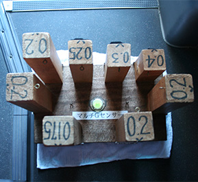 今回機材提供しましたマルチGセンサーは、もともとトラック等の研修所で使われていたものを、社内で改良したものです。倒れるのが一方向だったのを、前後左右方向に倒れるようにし、あわせて複数のG値に対応できるよう改良しました。平成21年の中央技術委員会全国大会でも構造や寸法早見表など入れ発表させていただきました。